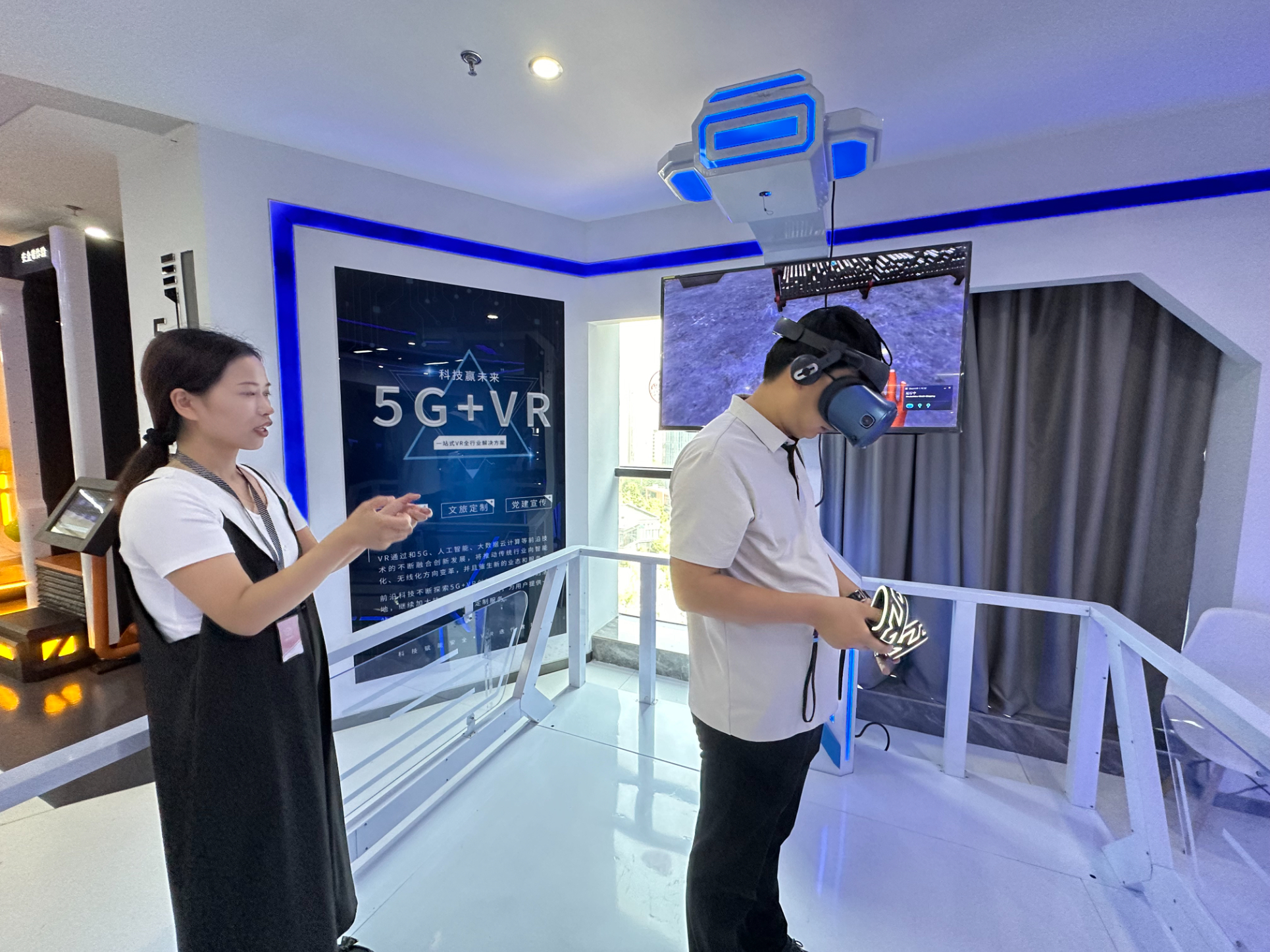 既然是智能化安全體驗館,怎么能少了VR設備呢!第三個展區便是今天的壓軸戲---VR安全體驗區。VR與安全體驗結合的優勢是它可以在虛擬現實中展現真實施工事故發生的場景,讓體驗者學習正確的安全施工方法,身臨其境,鍛煉體驗者應對事故發生的應急能力,通過虛擬現實更深刻的增強體驗者的施工知識。圖為雅努思員工穿戴VR設備進行安全體驗。