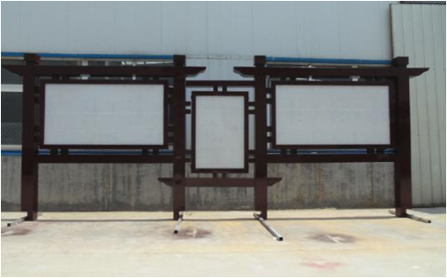 ?②鋼板和不銹鋼板的公告欄會(huì)采用鋼板烤漆的工藝,表面進(jìn)行防腐處理。可埋于地面以下,也可用膨脹螺絲固定在硬化地板表面。為了遮擋陽(yáng)光和雨水,宣傳欄一般會(huì)有頂棚。宣傳欄有前開門和后開門之分,前開門用玻璃鎖,后開門用普通鎖具就可以,內(nèi)容多是畫面或紙張內(nèi)容。木材的宣傳欄多用在園林中,這種宣傳欄不太實(shí)用,一般只能張貼戶外畫面。由于木質(zhì)的宣傳欄不能把內(nèi)容藏于玻璃內(nèi)部,只能在外面,所以內(nèi)容得不到保護(hù)。