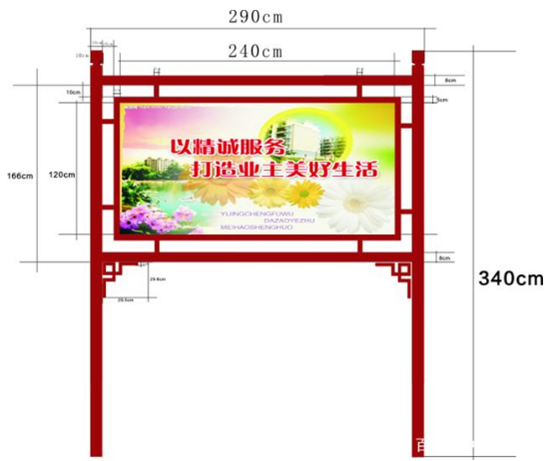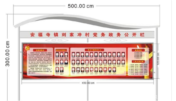 ?③黨政或小區(qū)大型宣傳欄的高度一般在兩米二以上,可帶頂棚,也可不帶頂棚,不帶頂棚的可以稍矮一些。頂棚材質(zhì)多為陽(yáng)光板,也可是玻璃,或不銹鋼板。其寬度一般在兩米五左右,也有豎版的公告欄,寬度在一米左右。制定宣傳欄的寬度時(shí)應(yīng)考慮公告欄內(nèi)部放置內(nèi)容的尺寸,寬度一般是海報(bào)寬度的整數(shù)倍,再加十幾公分,這樣能夠利用宣傳欄的宣傳空間。單元宣傳欄的寬度一般在一米以內(nèi),橫版的較常見(jiàn)一些。常用規(guī)格如600mm*800mm